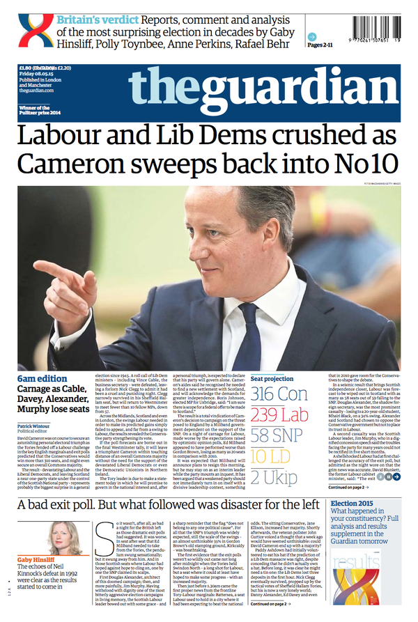 Nate Silver, formerly of the New York Times and now writing his FiveThirtyEight blog as part of his gig with ESPN, was forecasting 272 seats for Conservatives and 271 for Labor – dead even. It takes 326 seats for a clear majority, and in the end Tories won big with 331 seats – 99 more than their main rival Labor.