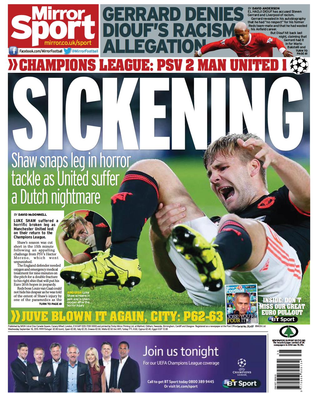 Manchester United’s England defender Luke Shaw suffered a double leg fracture as his team lost 2-1 at PSV Eindhoven in their opening Champions League group game on Tuesday night. Former PSV star Memphis Depay had given United a first-half lead before the Dutch champions scored twice, including a goal by Hector Moreno, whose tackle earlier had led to Shaw’s injury.