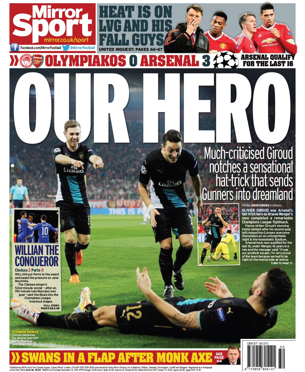 Arsenal and Chelsea will join Manchester City in the knockout stages of the Champions League. The draw for the last 16 will be held on Monday afternoon. The Gunners needed to win by two clear goals in Greece on Wednesday and were seen home by Olivier Giroud’s first hat-trick for the club.