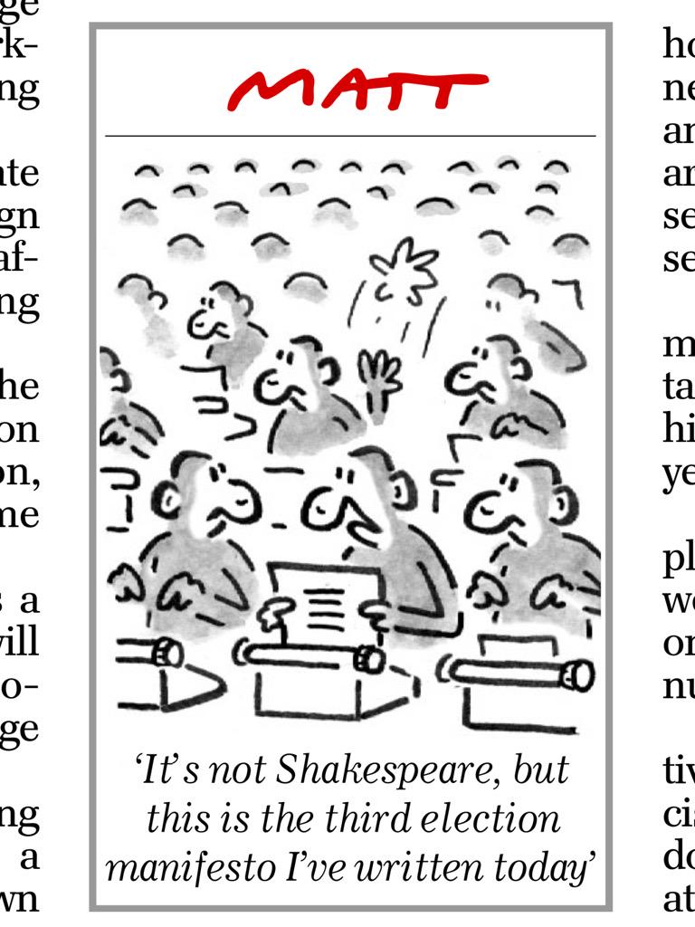 This is manifesto week, with the major parties keen to bring their main messages into focus. Labour will emphasize “economic responsibility” at Monday’s launch in Manchester. For the Tories on Tuesday, it could be a chance to reset the campaign following something of a “wobbly” week. The Greens, meanwhile, have suggested banning the Grand National. Andrew Rawnsley writes in The Guardian: