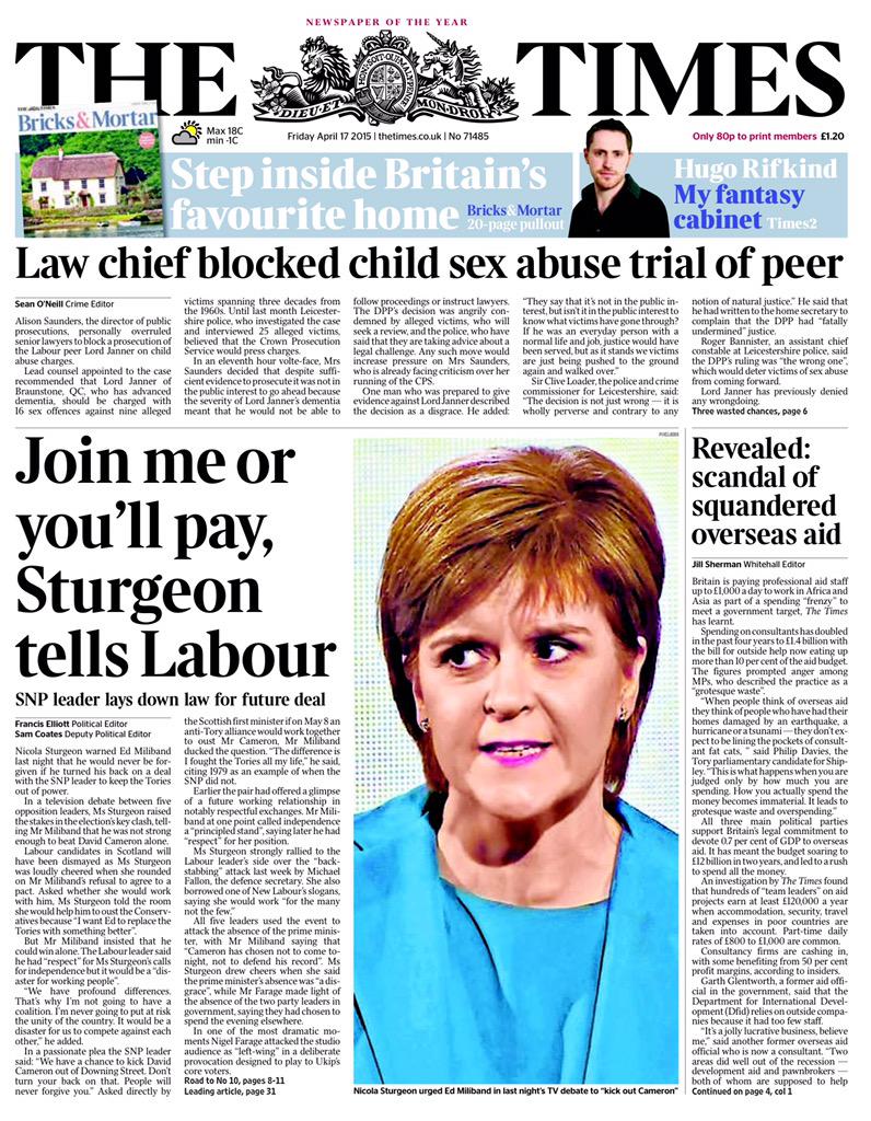 Also in Scotland, the Labour Party is preparing for an electoral “tsunami” according to the FT, while BuzzFeed reports that the deputy leader of the Scottish Labour Party has found no hiding place on social media – from her dad.