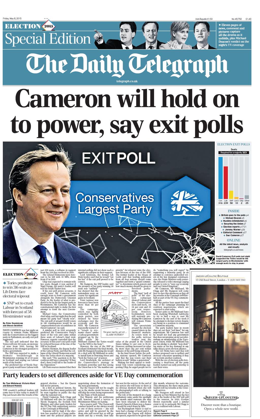 The BBC’s 10pm exit poll appeared to repudiate the final opinion polls, which showed the main parties neck-and-neck, by indicating that the Conservatives would win the most seats – 316, against Labour’s 239 – but still short of a majority.